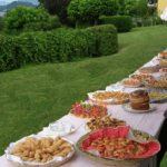 Le varie portate vengono adagiate su diversi tavoli, meglio abbondare in maniera da evitare inutili code e dare l’impressione di essere “a mensa”, i tavoli saranno decorati e rifiniti, magari a seconda delle pietanze servite, importante dare modo agli ospiti di sedersi qua e là cercando di posizionare sedie e tavoli d’appoggio in maniera strategica e capaci di ospitare la maggior parte degli invitati. Ideale se si decide di fare un matrimonio d’estate.
