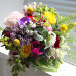 E quindi via libera a fiori multicolore nel nostro bouquet, che ancora una volta è un inno alla gioia e alla semplicità, ricco di fiori di campo, margherite e girasoli, dalla composizione spesso disordinata, arricchiti di nastri coloratissimi e perline.